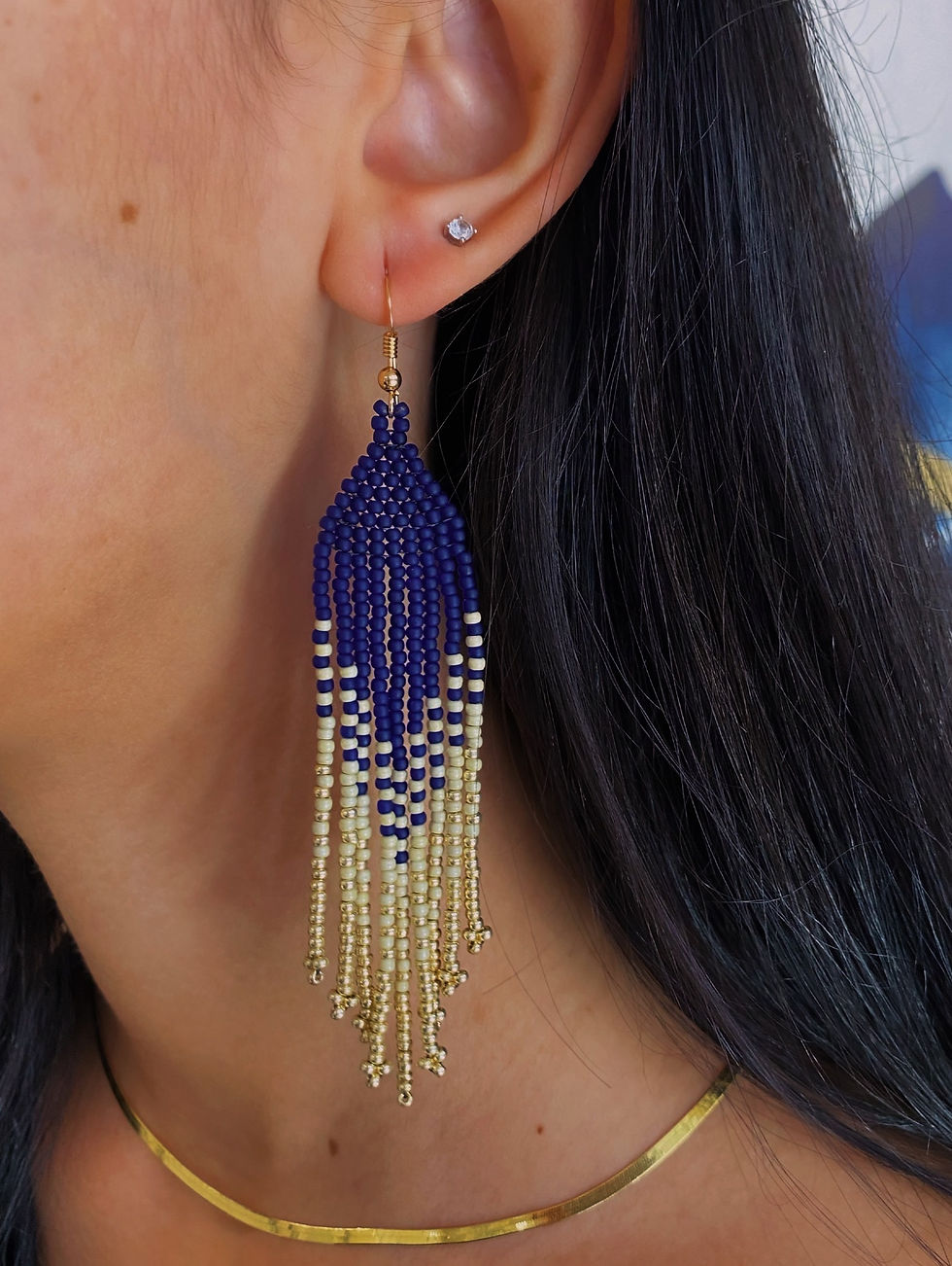 Cream, Dark Grey and Gold Beaded Fringe Earrings